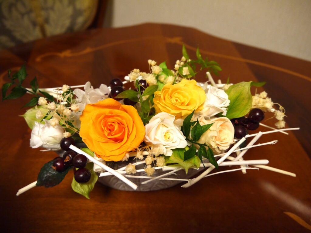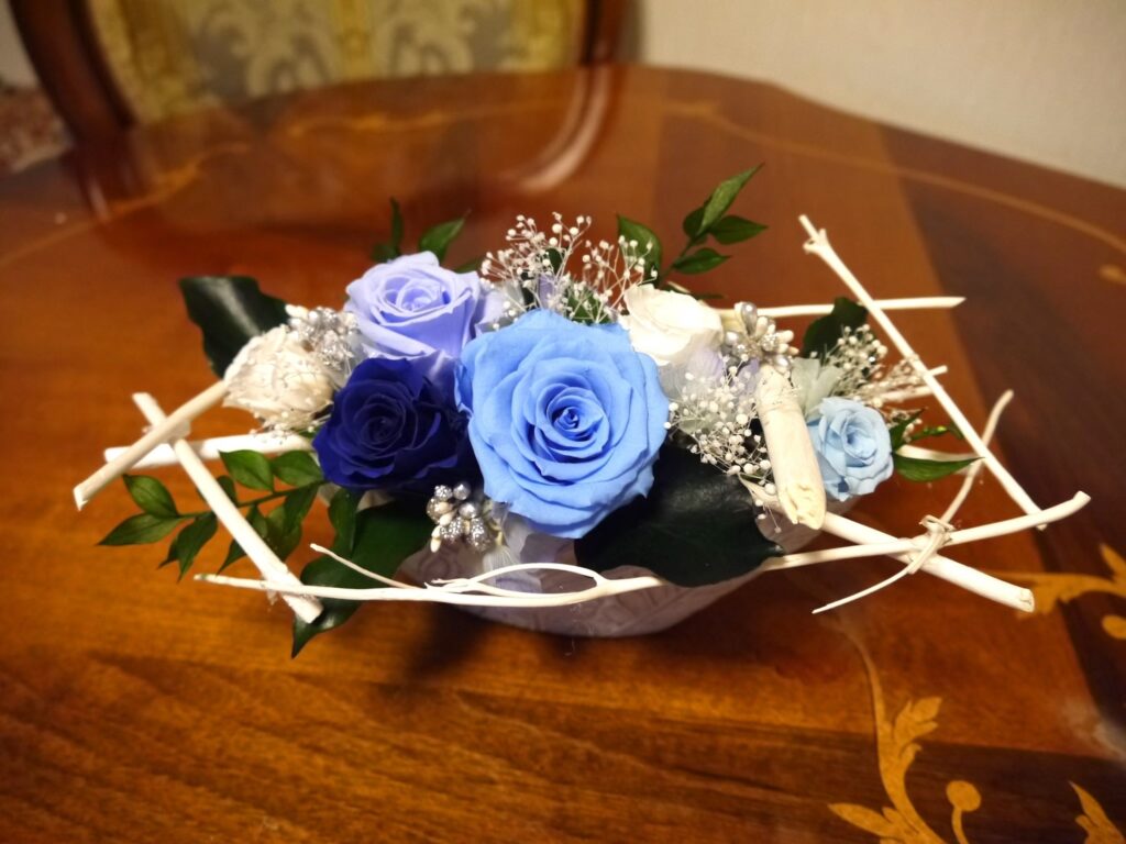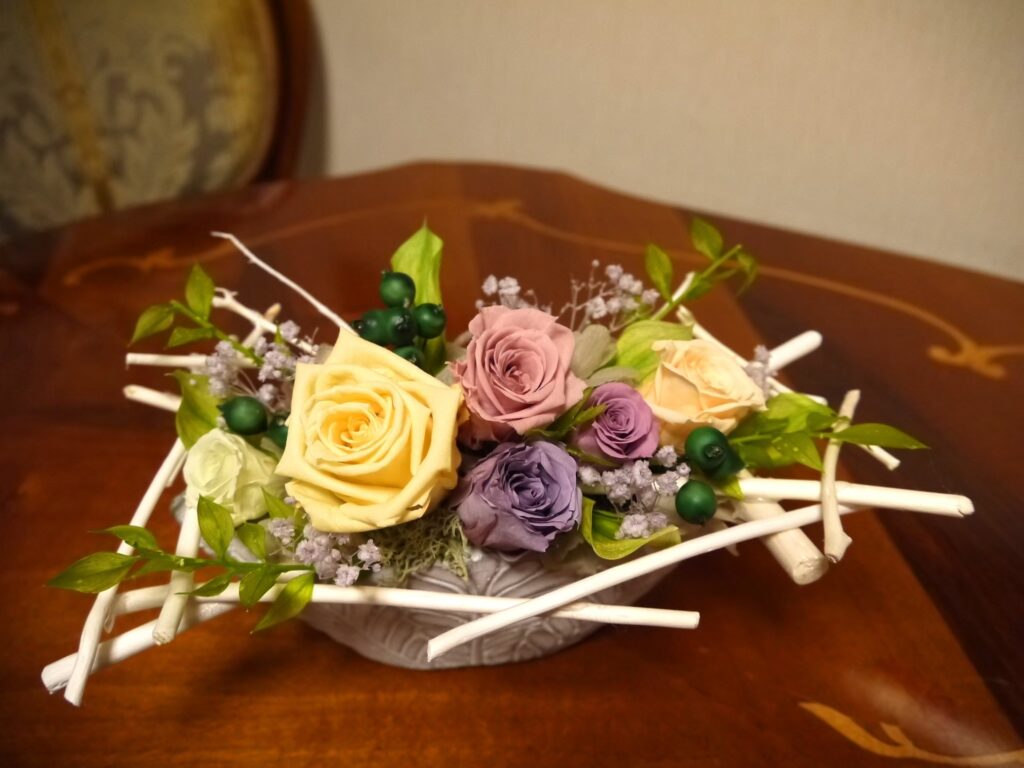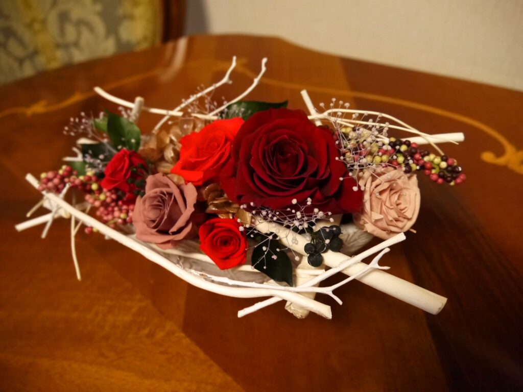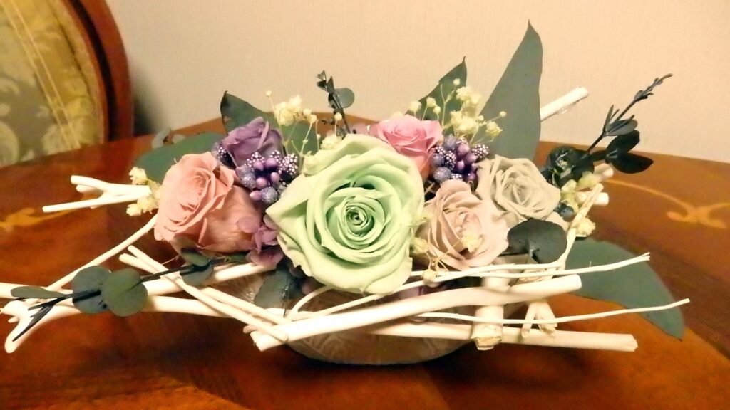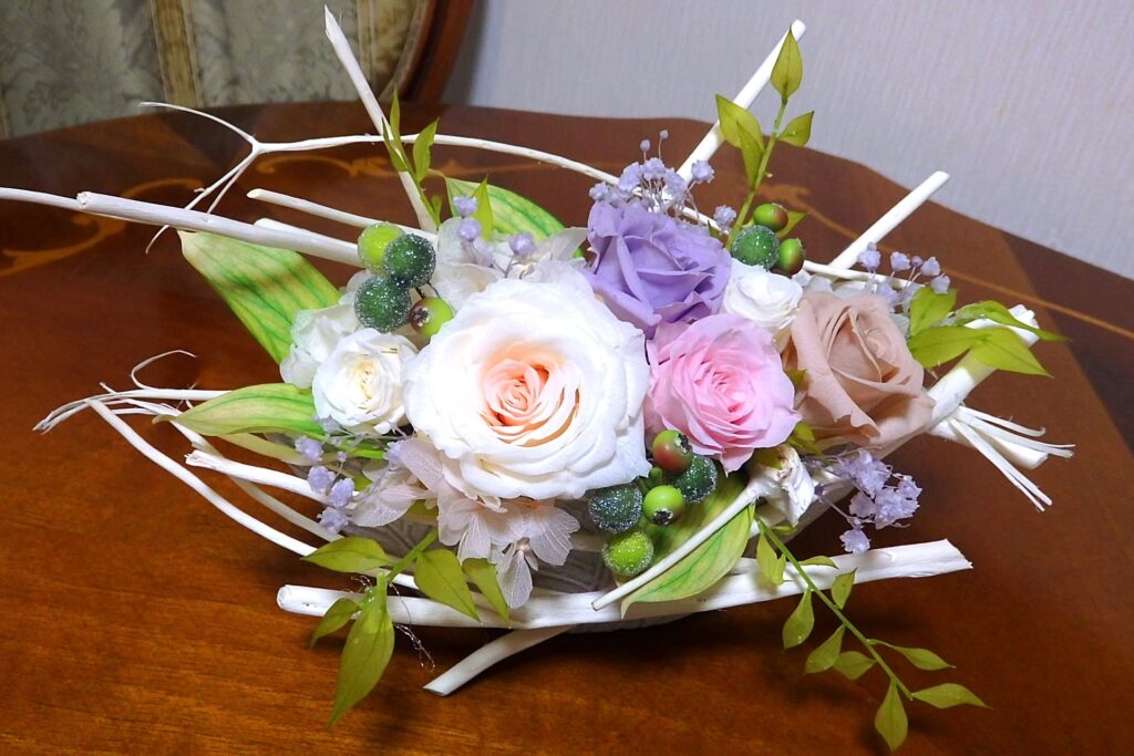 白枝で枠を作る新鮮なデザイン。 さわやかな白枝で作る基本形ホリゾンタルのアレンジです。