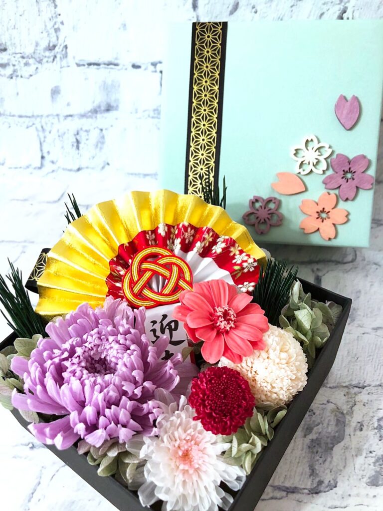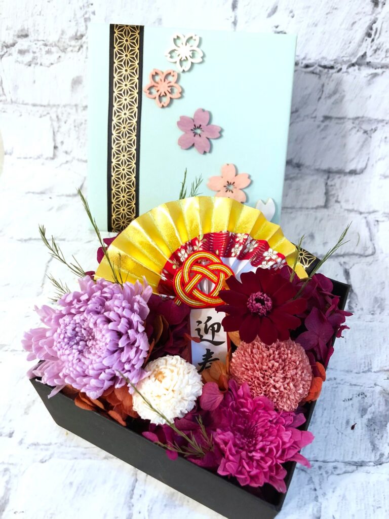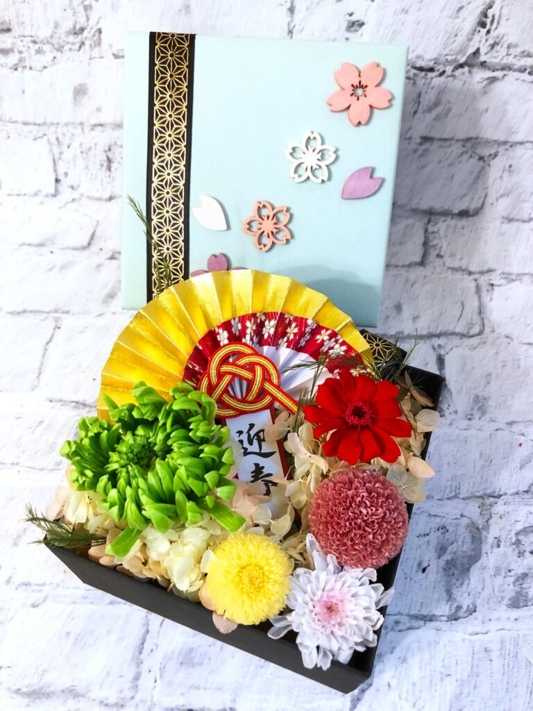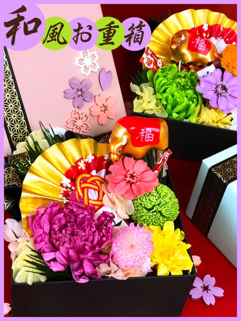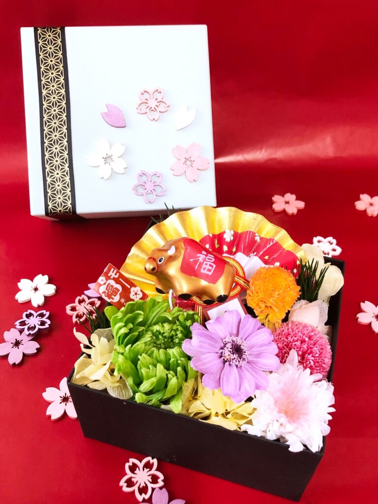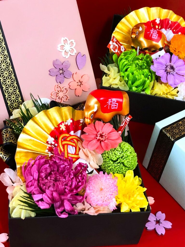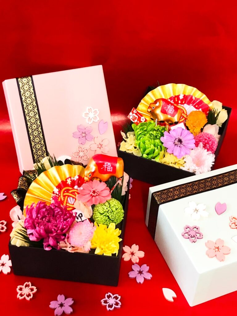 お正月を盛り上げるボックスアレンジは蓋の装飾から始まります。 華やかな桜のウッドレリーフとリボンで和のデコレーション。