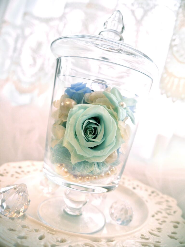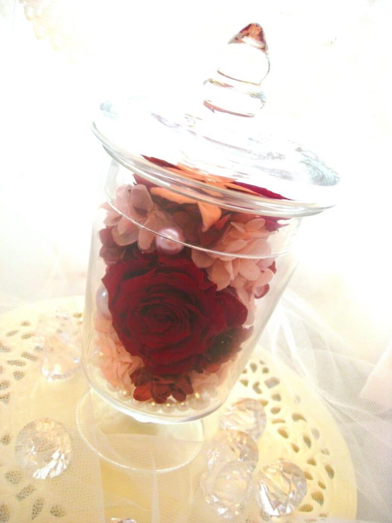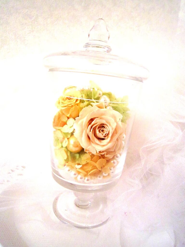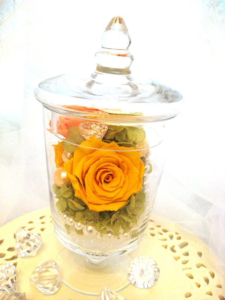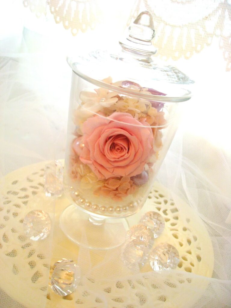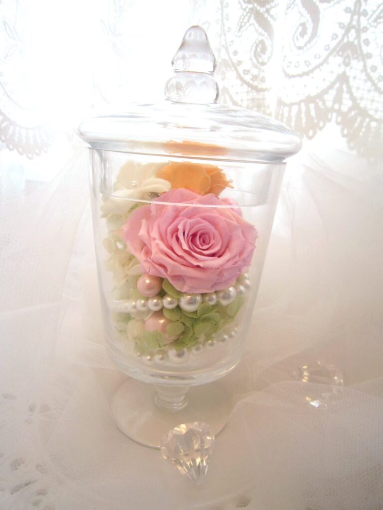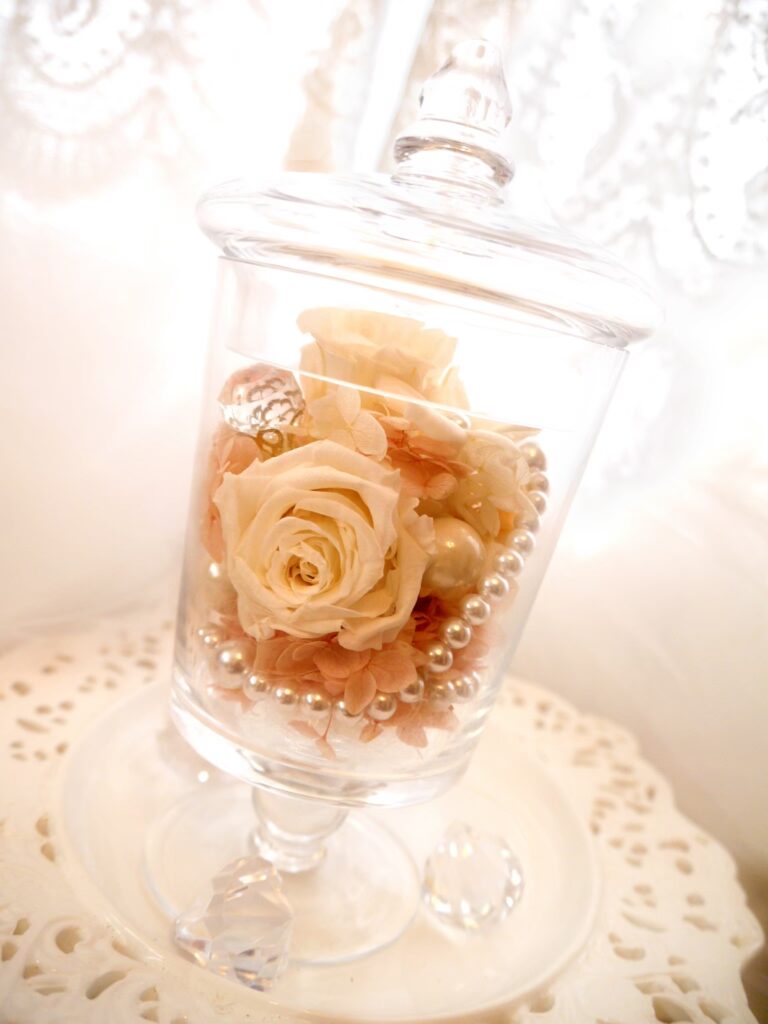 密閉式なので、ホコリもかぶらず美しく保管できて便利。 中身は取り出せるように制作しますから、ガラスは丸洗いもOK! いつも美しい状態で飾ってあげてください。